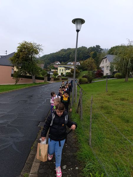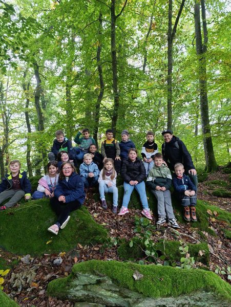 Die Klasse 1 besuchte am 08.10.2024 die schöne Felsenlandschaft rund um Bollendorf. Gemeinsam mit Klassenlehrer Herr Hotzwik und Frau Faber tauchten sie in die fantasievolle Geschichte rund um König Bollybur ein und entdeckten verschiedene einzigartige Felsen. Am Stein der Wahrheit fanden die Kinder dann heraus, dass die vorgelesene Geschichte der Wahrheit entsprechen muss, da ihre Hände nicht pechschwarz aus dem Felsloch herauskamen. Wieder am Waldsportplatz angekommen überraschten zwei Mütter die Kinder mit Kakao, Tee, Muffins, Fingerfood und kleinen Spielen, sodass ein aufregender Vormittag einen gelungenen Abschluss fand.