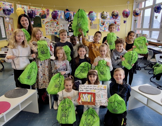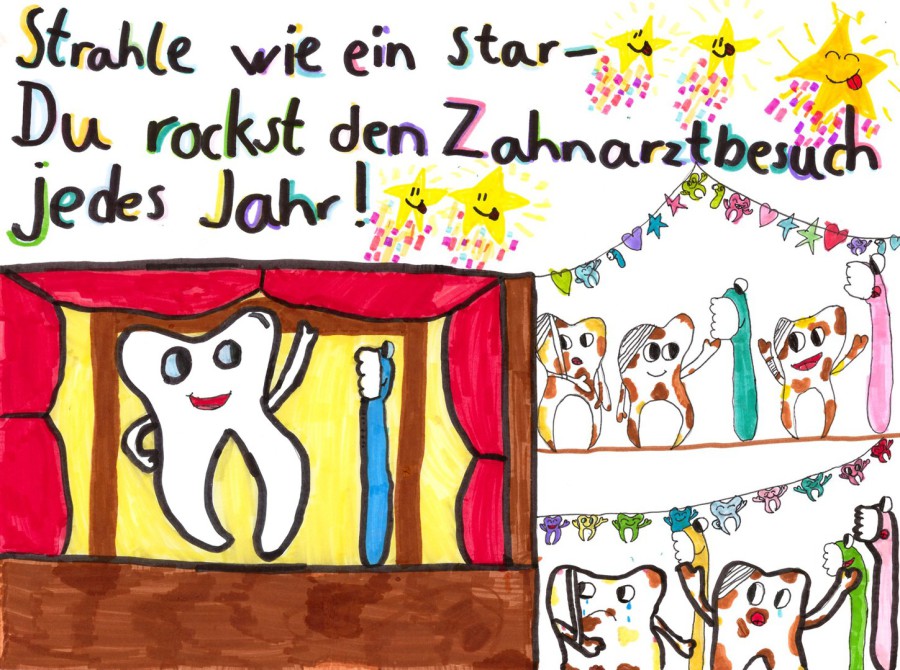 Anlässlich des Tages der Zahngesundheit hat die Klasse 3b am Wettbewerb der LAGZ RLP e.V. (Landesarbeitsgemeinschaft Jugendzahnpflege Rheinland-Pfalz e.V.) teilgenommen. Mit dem kreativen Werbespruch „Strahle wie ein Star – Du rockst den Zahnarztbesuch jedes Jahr“ und der tollen gestalterischen Umsetzung des Werbeplakates durch Paula Maya Scholer hat die Klasse 3b die Jury überzeugt. Neben prall gefüllten Turnbeuteln für jedes Kind, durfte sich die Klasse auch über ein Preisgeld von 100€ freuen und hofft nun, jedes Kind mit ihrem Plakat für den Besuch beim Zahnarzt begeistern zu können.