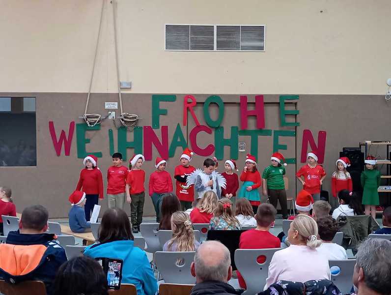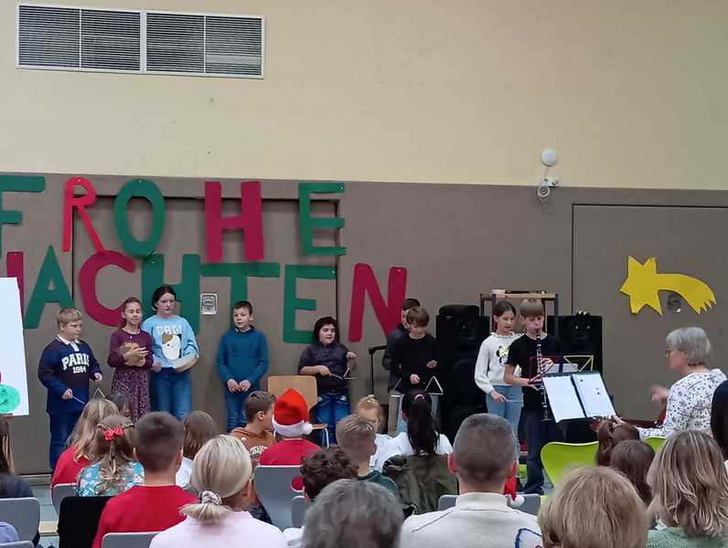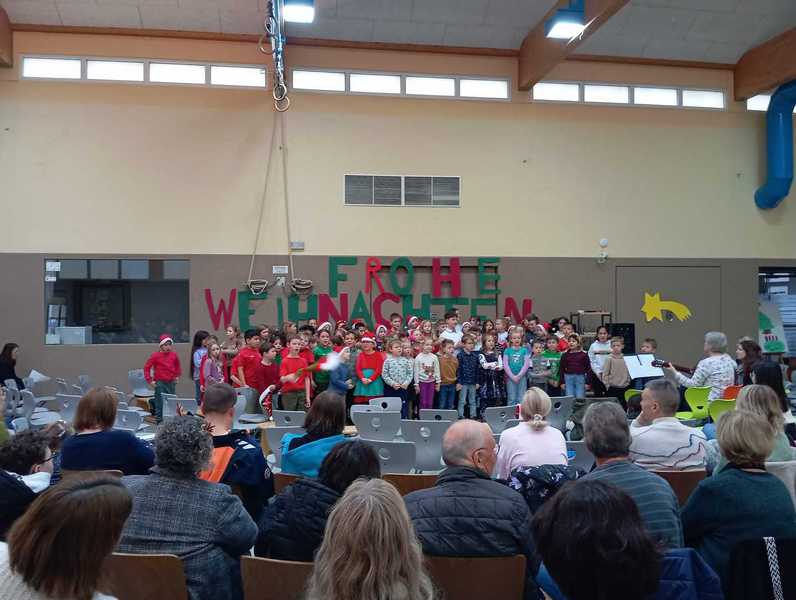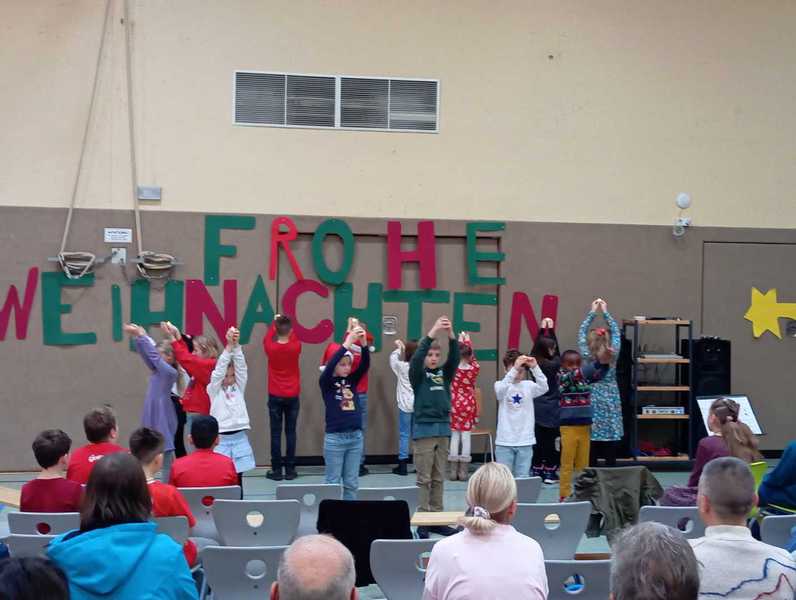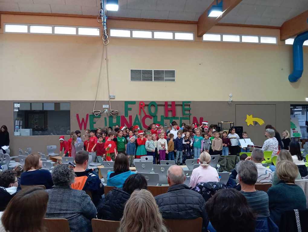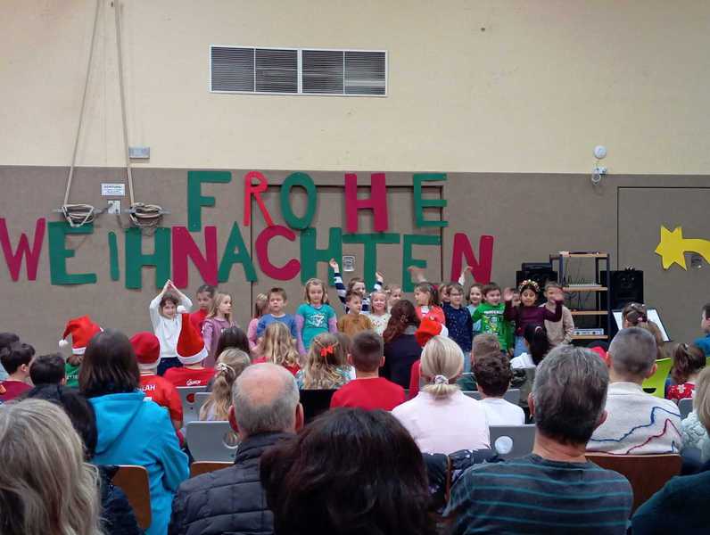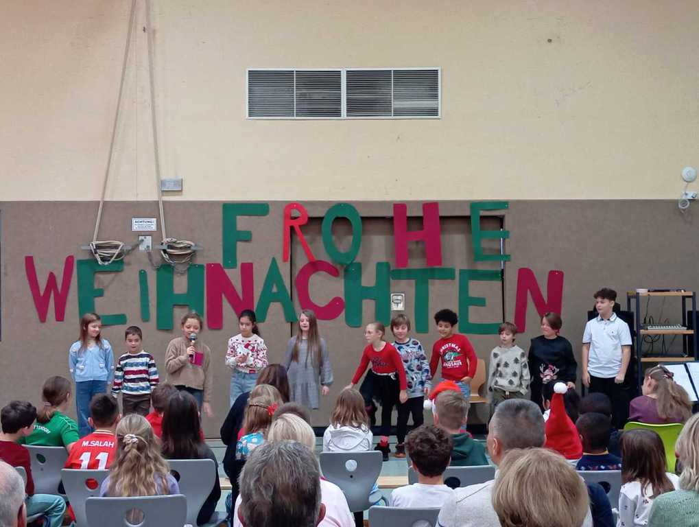 Am letzten Schultag vor den Weihnachtsferien fand unsere diesjährige Weihnachtsfeier in der weihnachtlich geschmückten Turnhalle statt. Die Kinder hatten dafür sehr fleißig in ihren Klassen geprobt und zeigten ein bunt gemischtes Weihnachtsprogramm: Nicht nur Gedichte und Lieder wurden vorgetragen, sondern auch zwei kleine Theaterstücke, eine Klanggeschichte sowie Cupsongs und ein Instrumentalstück.